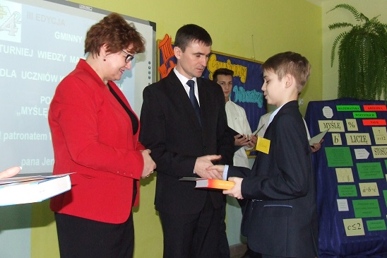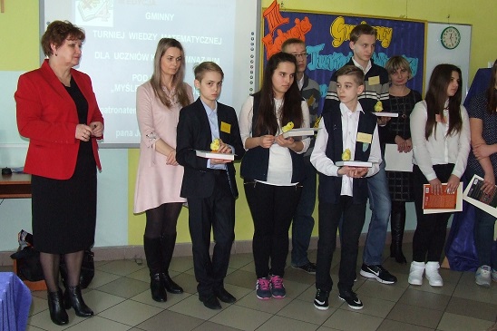Wszyscy uczestnicy za aktywny udział w konkursie otrzymali pamiątkowe dyplomy oraz atrakcyjne nagrody książkowe ufundowane przez Wójta Gminy Potok Wielki – pana Jerzego Pietrzyka. Nauczycielom matematyki wręczono podziękowania za przygotowanie uczniów do turnieju. Nagrody, dyplomy oraz podziękowania wręczyła p. Bożena Kusz - Sekretarz Gminy Potok Wielki. Uczniowie uczestnicząc w tym konkursie mieli możliwość sprawdzenia swojej wiedzy z dziedziny matematyki w zdrowej rywalizacji z kolegami i koleżankami z całej gminy. Gratulujemy wszystkim uczestnikom konkursu. Mamy nadzieję, iż w tym dniu wszyscy miło i przyjemnie spędzili czas, bawiąc się z matematyką. Po przeżyciu tego konkursu większość z uczniów być może zgodzi się z Euklidesem, że „w matematyce nie ma drogi specjalnej dla królów.”