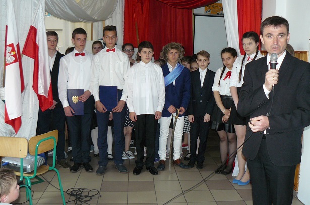 225 lat temu posłowie wybrani przez obywateli Rzeczypospolitej przyjęli pierwszą europejską konstytucję. W swoim wystąpieniu uczniowie przybliżyli znaczenie tego wydarzenia w historii naszej Ojczyzny. Przypomnieli tło historyczne wydarzeń z 3 maja 1791r. i wyjaśnili, dlaczego jest to nadal tak ważny dzień dla Polski. W uroczystości brał udział poczet sztandarowy naszej szkoły. Nie zabrakło biało – czerwonej flagi państwowej oraz hymnu. Zwrócono uwagę na doniosłość Konstytucji 3 Maja. Po odśpiewaniu hymnu narodowego uczniowie zaprezentowali montaż słowno – muzyczno - teatralny, oddający klimat tamtych czasów. Młodzież ten nadzwyczajny temat przygotowała i przedstawiła w sposób bardzo ciekawy i wniosła dużo serca i zaangażowania. Występ prowadzili chłopcy z klasy III gimnazjum – Jakub Żelazko i Dawid Wojciechowski.