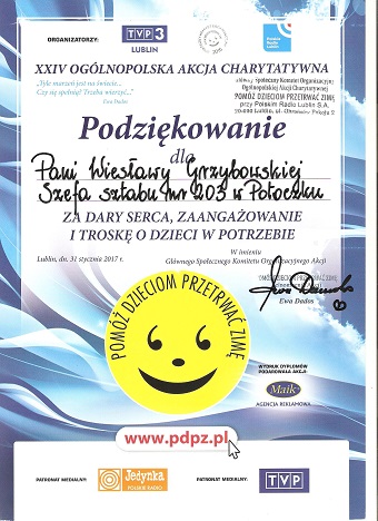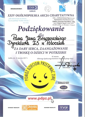W bieżącym roku szkolnym po raz dziesiąty przystąpiliśmy do Ogólnopolskiej Akcji Charytatywnej „ Pomóż dzieciom przetrwać zimę”. Akcja ta prowadzona jest przed świętami Bożego Narodzenia z myślą o dzieciach pochodzących z rodzin wielodzietnych, rozbitych, niepełnych, będących w trudnej sytuacji materialnej i losowej.