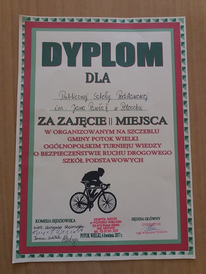 W dniu 06.04.2017 r. w Zespole Szkół w Potoku Wielkim odbyły się gminne eliminacje Ogólnopolskiego Turnieju Wiedzy Bezpieczeństwa o Ruchu Drogowym. Konkurs miał na celu podnoszenie bezpieczeństwa i świadomości stosowania zasad w ruchu drogowym użytkowników dróg. Swoim zakresem obejmował test dotyczący wiedzy o ruchu drogowym oraz praktyczną jazdę rowerem. Do współzawodnictwa przystąpiły drużyny ze szkół podstawowych i gimnazjów z terenu gminy. Naszą szkołę reprezentowali uczniowie z klasy V i VI szkoły podstawowej: Agata Abram, Patrycja Tracz, Maksymilian Taracha, Paweł Skupiński oraz uczniowie z klasy III gimnazjum: Mateusz Brzozowski, Łukasz Mirosław i Marcin Tracz. Nasi uczniowie, zarówno ze szkoły podstawowej, jak i z gimnazjum, zajęli II miejsce. Do konkursu uczniów przygotowała p. M. U. Olszówka.
