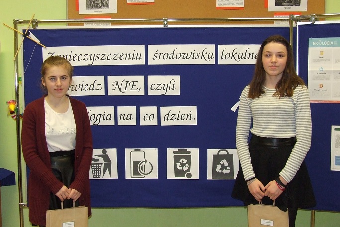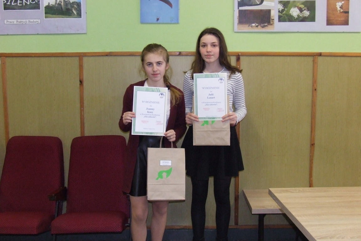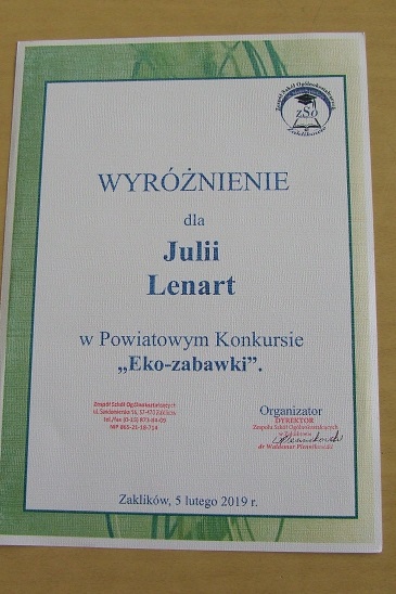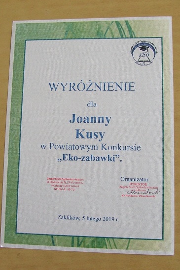 Uczennice klasy III gimnazjum: Joanna Kusy oraz Julia Lenart wzięły udział w Powiatowym Konkursie „Eko - zabawki”, który zorganizował Zespół Szkół Ogólnokształcących w Zaklikowie. Komisja konkursowa dokonała oceny prac biorąc pod uwagę estetykę, różnorodność technik wykonania oraz samodzielność i wkład pracy. Uczennice samodzielnie przygotowały prace przestrzenne będącej projektem zabawki wykonanej z surowców wtórnych oraz materiałów całkowicie ekologicznych. Prace naszych gimnazjalistek spodobały się komisji, dziewczęta otrzymały wyróżnienia. W dniu 5 lutego Asia i Julka wspólnie z wychowawcą klasy III - p. Ewą Kusz uczestniczyły w warsztatach ekologicznych „Ekologia na co dzień” połączonych z wręczeniem nagród laureatom konkursu. Dziewczęta otrzymały piękne nagrody książkowe oraz dyplomy. Wspólnie z innymi uczestnikami konkursu zwiedzały i podziwiały wystawę prac „Eko – zabawki”. Serdecznie gratulujemy uczennicom i życzymy dalszych sukcesów plastyczno - artystycznych.