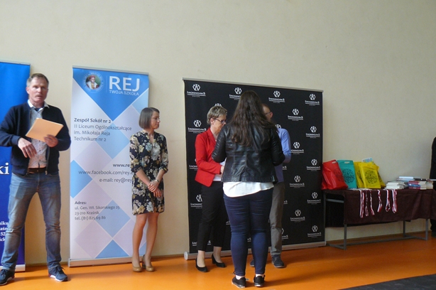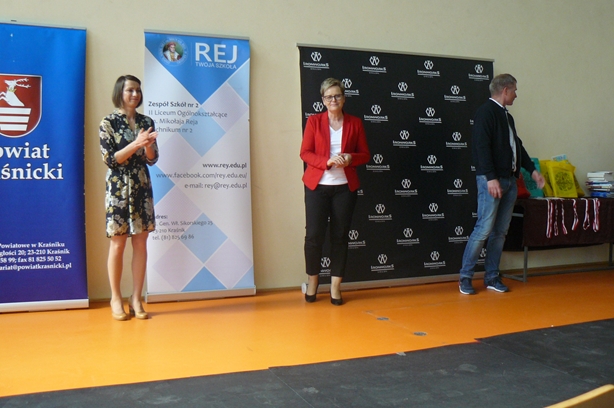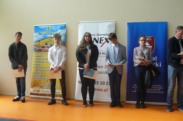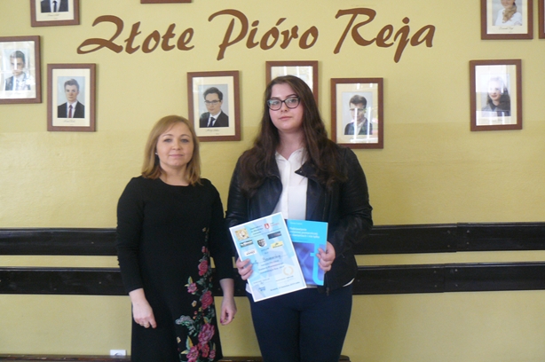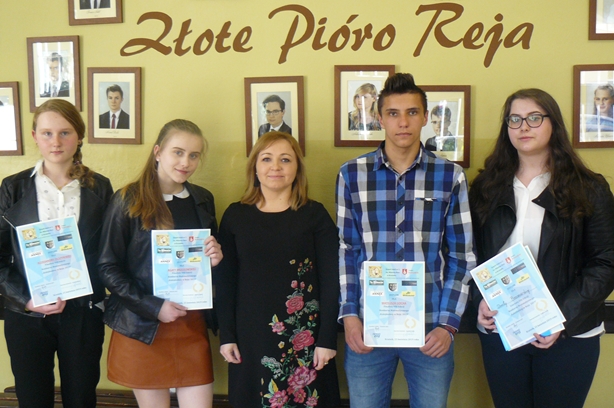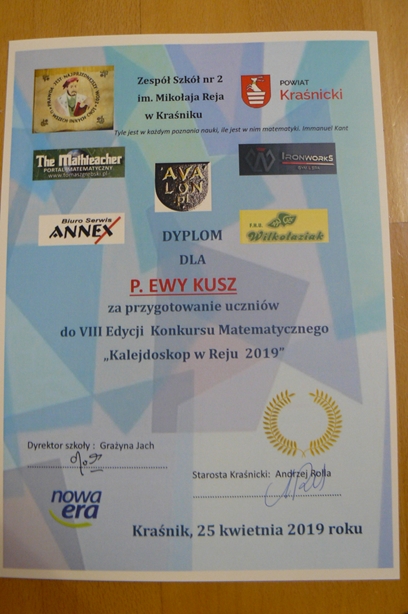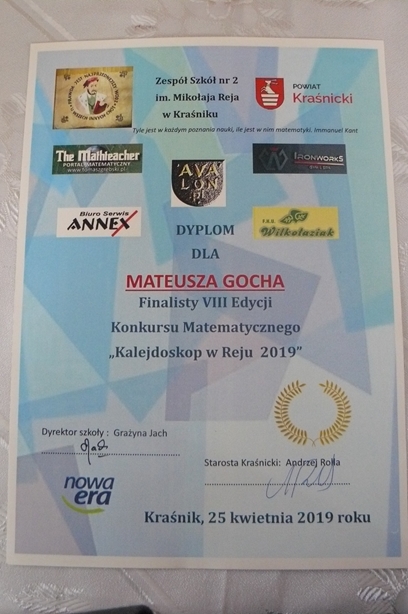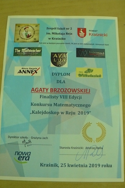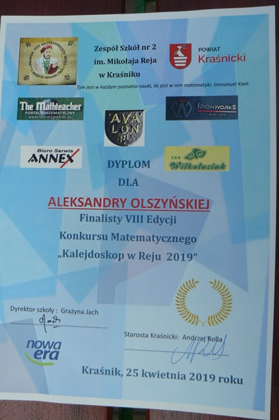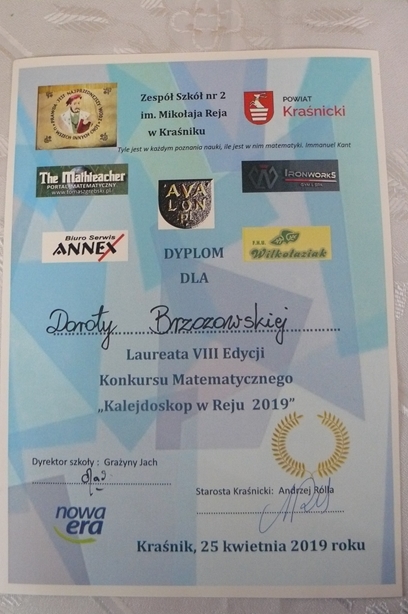 W dniu 25 kwietnia 2019 r. uczniowie naszej szkoły wzięli udział w II etapie Powiatowego Konkursu Matematycznego „Kalejdoskop w Reju”, który odbył się w Zespole Szkół Nr 2 w Kraśniku LO im. M. Reja. Honorowy patronat nad konkursem objął Starosta Kraśnicki Krzysztof Staruch. Koordynatorem tego konkursu była nauczycielka matematyki – p. Ewa Kusz. Celem zorganizowania tego konkursu było: rozwijanie zainteresowań matematycznych uczniów, doskonalenie umiejętności matematycznych, motywowanie uczniów do poszerzania swojej wiedzy, mobilizowanie uczniów do samodzielnej i systematycznej pracy oraz umożliwienie uczniom wykazanie się wiedzą matematyczną. Do finału tego konkursu przystąpiło łącznie 135 uczniów. Naszą szkołę reprezentowali: Aleksandra Olszyńska, Agata Brzozowska, Dorota Brzozowska oraz Mateusz Goch. Uczniowie samodzielnie rozwiązywali 24 zadania (zamknięte i otwarte) przygotowane przez nauczycieli matematyki LO w Kraśniku. Wszyscy uczniowie otrzymali dyplomy finalistów konkursu. Tytuł Laureata uzyskała Dorota Brzozowska. Gratulujemy naszym wspaniałym uczniom, życzymy im dalszych sukcesów w dziedzinie matematyki.
