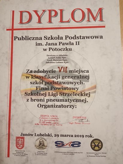 29 marca 2019 r. uczniowie klasy III gimnazjum wzięli udział w eliminacjach powiatowych Szkolnej Ligi Strzeleckiej z broni pneumatycznej zorganizowanych przez Szkolne Koło LOK działające przy Zespole Szkół im. Wincentego Witosa w Janowie Lubelskim. Naszą szkołę reprezentowali: Mateusz Goch - karabin pneumatyczny, Łukasz Jakubiec - karabin pneumatyczny oraz Julia Lenart - pistolet pneumatyczny. Drużyna w tym składzie zdobyła VII miejsce w klasyfikacji generalnej szkół podstawowych. Gratulujemy uczniom i życzymy dalszych sukcesów! Opiekę nad uczniami sprawował nauczyciel edukacji dla bezpieczeństwa - p. Mirosława Butryn.