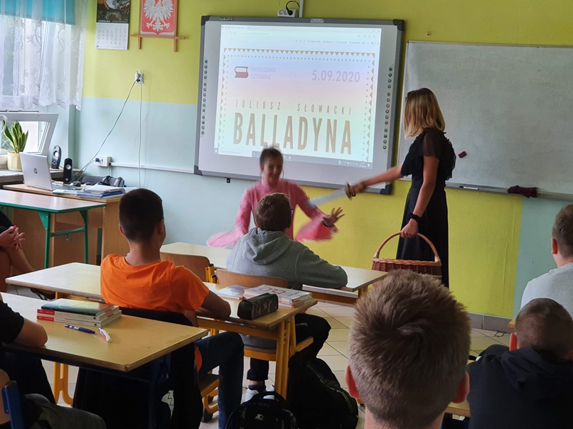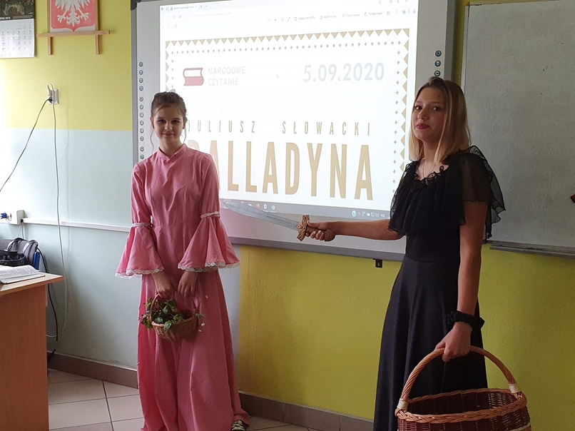 Wychodząc naprzeciw inicjatywie Pary Prezydenckiej, uczniowie i nauczyciele naszej szkoły wzięli aktywny udział w tym wydarzeniu, które miało miejsce w poniedziałek 07 września. Na początku nauczycielka języka polskiego – p. Mariola Wójcik dokonała krótkiego wprowadzenia w klimat epoki romantyzmu, zapoznała uczniów z biografią Juliusza Słowackiego oraz omówiła najważniejsze zagadnienia poruszone w lekturze. Następnie uczniowie wysłuchali tekstu listu Prezydenta Andrzeja Dudy skierowanego do uczestników akcji oraz obejrzeli dwa krótkie filmy, w których Para Prezydencka zachęcała do wzięcia udziału w akcji oraz czytała fragmenty Balladyny. Na koniec uczennice klasy ósmej – Magdalena Sakłak i Gabriela Jakubiec wcieliły się w postać Aliny i Balladyny i przedstawiły krótką scenkę z dramatu. Z uwagi na bezpieczeństwo uczniów ze względu na pandemię w wydarzeniu wzięła udział jedynie klasa VII i VIII. Należy dodać, że tego dnia każdy nauczyciel rozpoczynał lekcje w tych klasach od odczytania wybranego fragmentu dramatu.