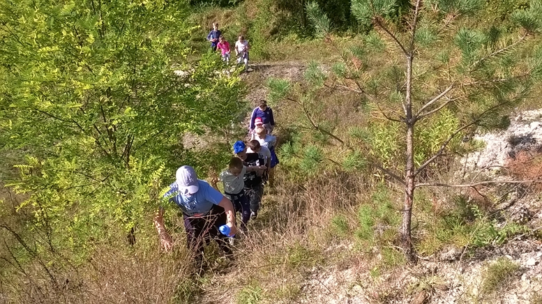 16 września, w piękny słoneczny dzień uczniowie klasy III wraz z wychowawczynią udali się na pobliskie wzniesienie zwane „Gaj Górą”, skąd obserwowali piękno otaczających lasów, stawów i pól. Tam też zobaczyli nieczynną kopalnię wapienia. Każdy z uczestników wycieczki miał za zadanie znaleźć skamieniałości organizmów żyjących dziesiątki milionów lat temu na naszym terenie oraz kamyk o ciekawym kształcie, z którego po powrocie do klasy wykonał rzeźbę używając materiałów plastycznych. W klasie została stworzona wystawa, która będzie przypominać zabawę w geologów.