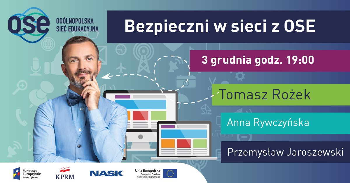 Już wkrótce, bo 3 grudnia o godz. 19.00, Anna Rywczyńska (NASK-PIB) i Przemysław Jaroszewski (CERT) spotkają się w sieci z Tomaszem Rożkiem, by porozmawiać o kwestiach związanych z bezpieczeństwem dzieci w interncie. Webinar „Bezpieczni w sieci z OSE” będzie też okazją do przekazania rodzicom i nauczycielom ważnych wskazówek dotyczących ich udziału w tworzeniu przyjaznej dla dziecka wirtualnej przestrzeni.