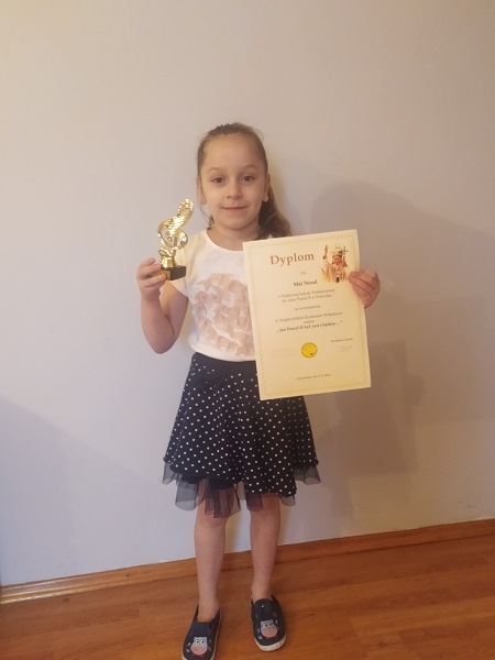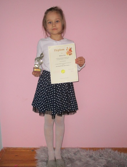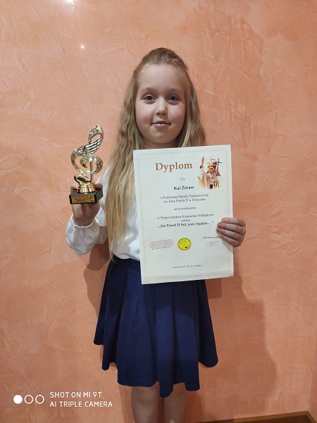 Uczennice kl. I, Milena Gut, Maja Nosal i Kaja Żóraw, wzięły udział w Wojewódzkim Konkursie Wokalnym online ,, Jan Paweł II – był, jest i będzie…”. Konkurs został zorganizowany przez Publiczną Szkołę Podstawową w Zespole Placówek Oświatowych im. Jana Pawła II w Gościeradowie i skierowany był do uczniów klas I – III szkół podstawowych. Głównym celem konkursu było pielęgnowanie pamięci o Ojcu Świętym Janie Pawle II oraz wskazanie uczniom osoby Papieża Polaka jako autorytetu moralnego współczesnego świata i wzoru do naśladowania. Na konkurs zostało przesłane nagranie wideo, na którym uczennice zaprezentowały swoje umiejętności wokalne. Ich umiejętności oceniło profesjonalne jury. Za wykonanie piosenki Znowu Cię spotykam przyznano im wyróżnienie. W nagrodę dziewczęta otrzymały pamiątkowe statuetki i dyplomy. Do konkursu uczennice przygotowały p. Teresa Janik i p. Maria Urszula Olszówka.