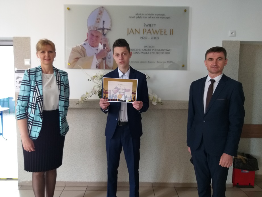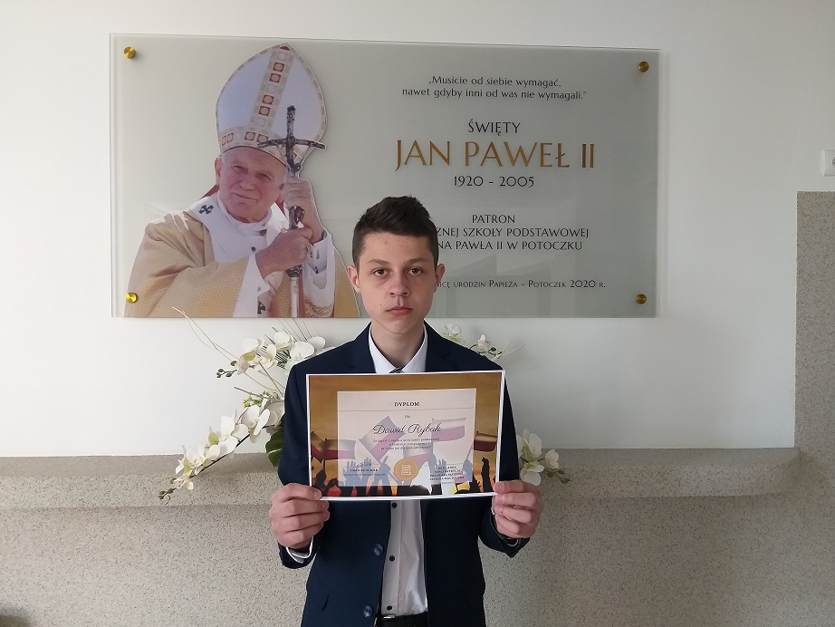 Uczeń klasy VIII Dawid Rybak zdobył I miejsce w konkursie plastycznym Czym jest dla mnie patriotyzm w kategorii: szkoły podstawowe. Konkurs przeprowadzili uczniowie z kl. III z ZSCKR w Potoczku w ramach programu Młodzi w Akcji +. Celem konkursu było uświadomienie uczniom znaczenia i ważności tematu „Patriotyzm”.