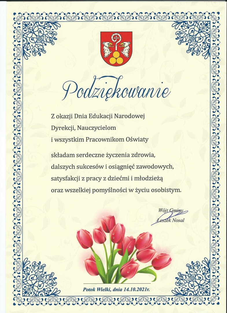 Życzenia Wójta Gminy Potok Wielki z okazji Dnia Edukacji Narodowej