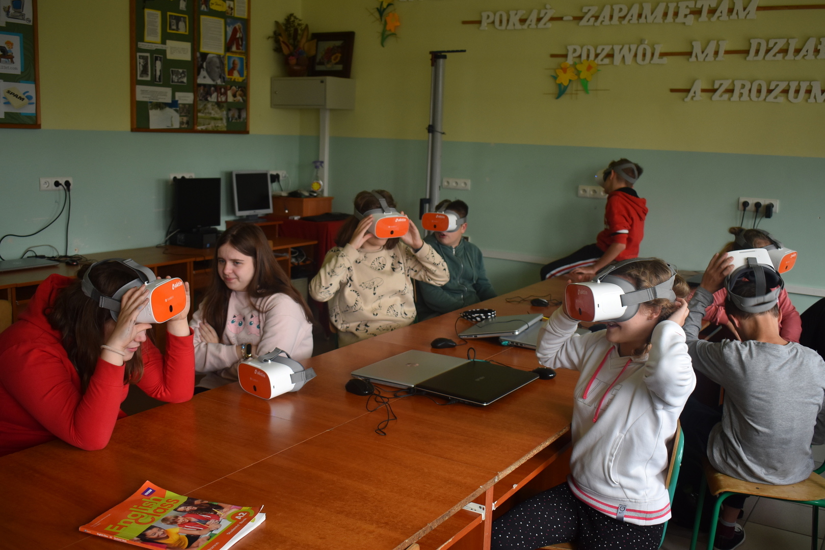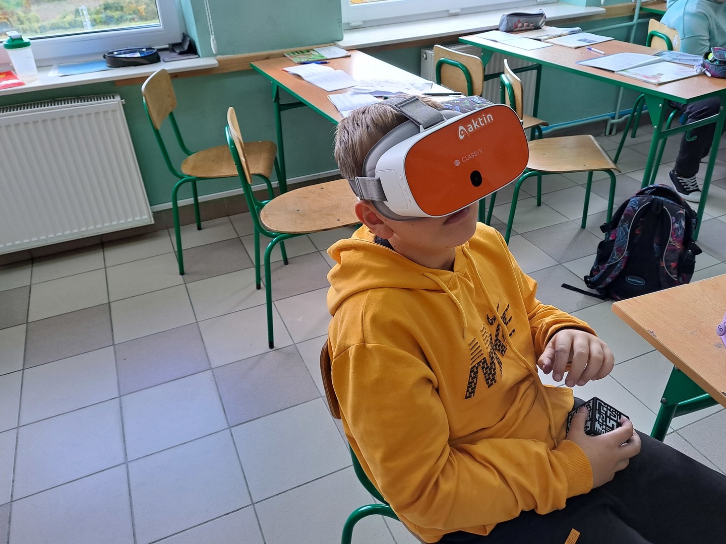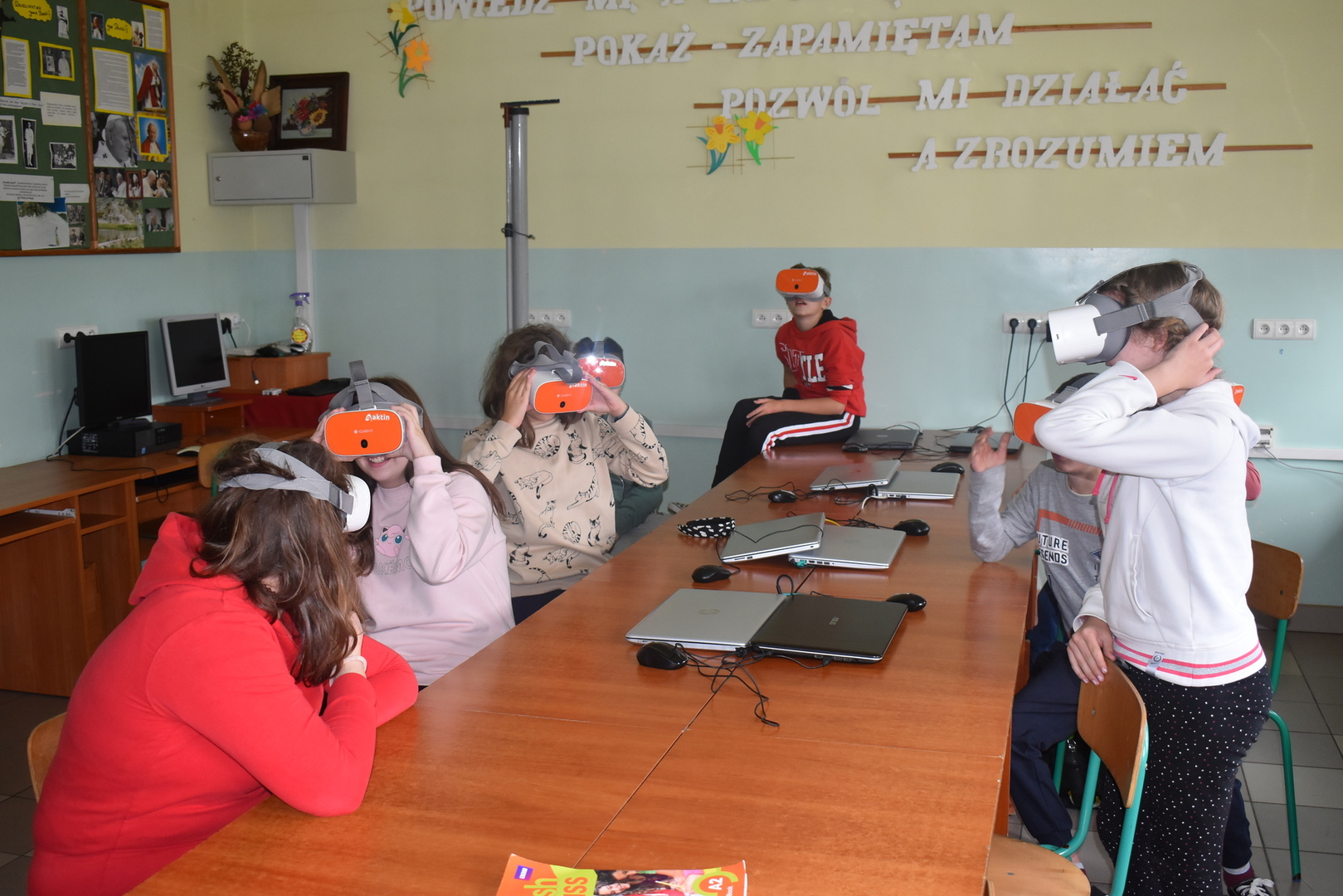 Okulary wirtualnej rzeczywistości przedstawiają świat, który wydaję się tak realny, że natychmiast zapominamy, gdzie właściwie się znajdujemy. Możemy się rozglądać, a okulary dostosowują w tym czasie obraz, a nawet dźwięk. VR pozwala uczniom poznać miejsca z całego świata bez konieczności opuszczania sali lekcyjnej. Dzięki użyciu okularów VR na zajęciach szkolnych, uczniowie mogą np. zajrzeć w głąb oceanu, badać własności brył czy oglądać żyrafy z bliska. Okulary VR to niesamowite narzędzie interaktywne, które wykorzystuje się na zajęciach, do realizacji podstawy programowej z wielu przedmiotów. Dzięki temu nauka w naszej szkole jest nie tylko przyjemniejsza, ale także efektywniejsza.