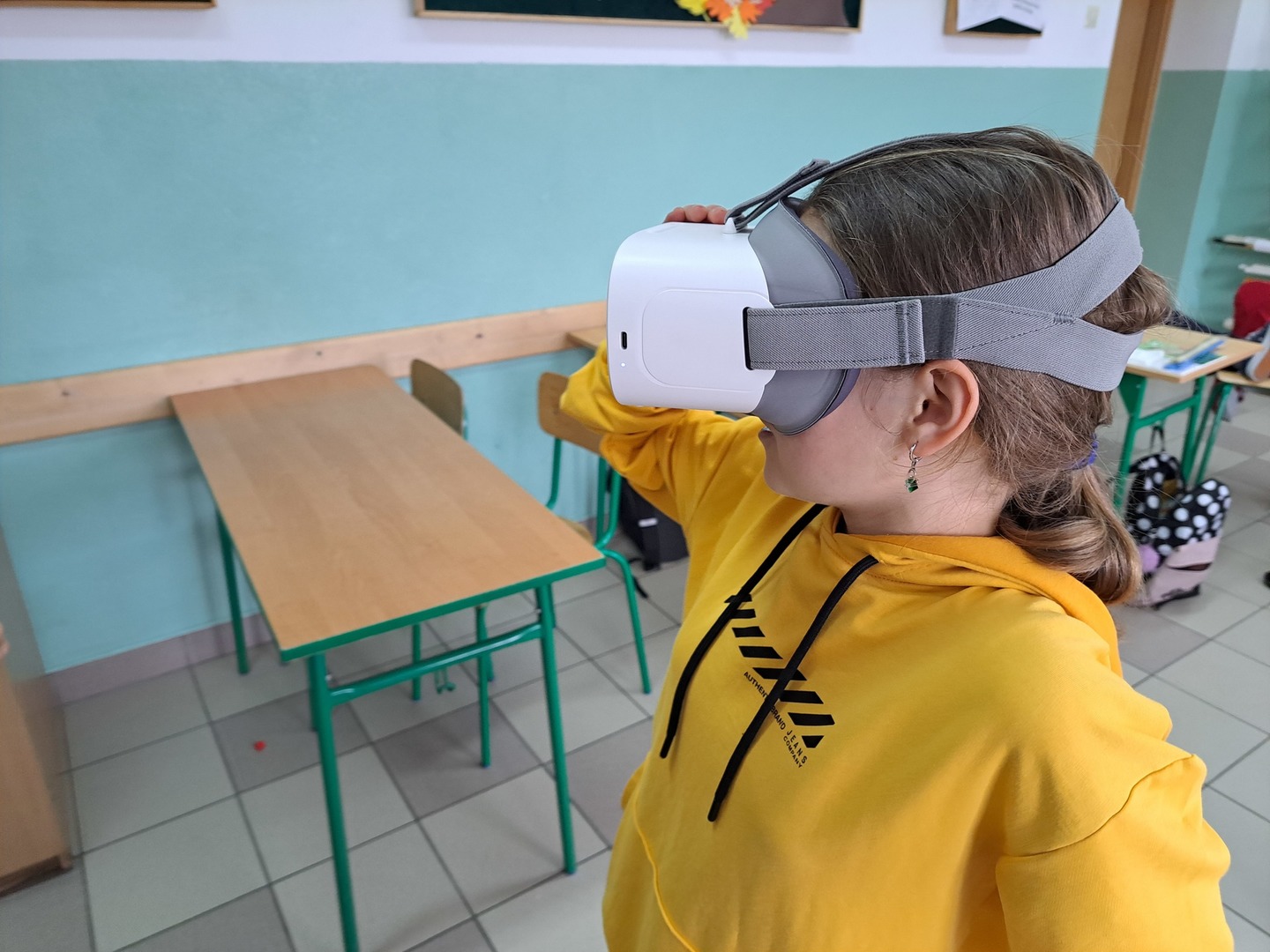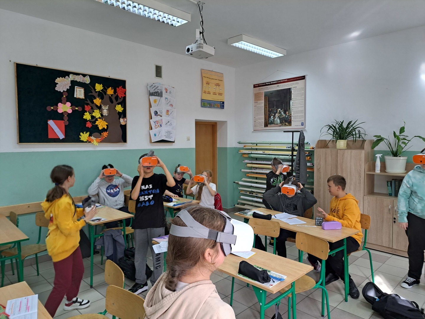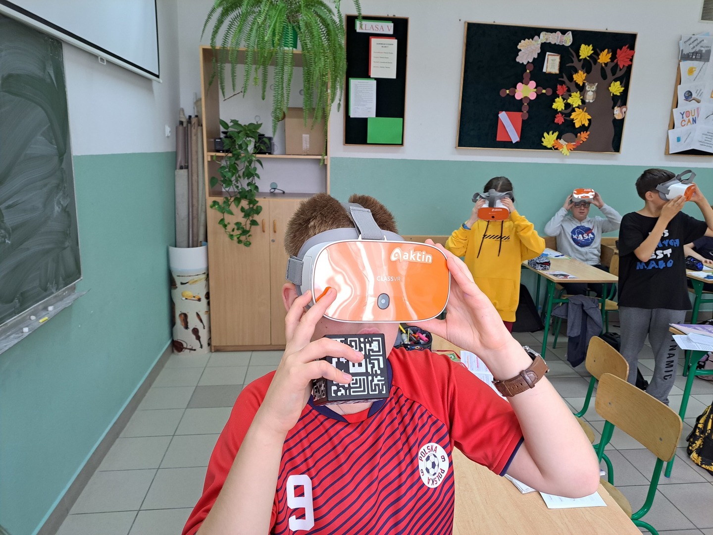 Okulary wirtualnej rzeczywistości przedstawiają świat, który wydaję się tak realny, że natychmiast zapominamy, gdzie właściwie się znajdujemy. Możemy się rozglądać, a okulary dostosowują w tym czasie obraz, a nawet dźwięk. VR pozwala uczniom poznać miejsca z całego świata bez konieczności opuszczania sali lekcyjnej. Dzięki użyciu okularów VR na zajęciach szkolnych, uczniowie mogą np. zajrzeć w głąb oceanu, badać własności brył czy oglądać żyrafy z bliska. Okulary VR to niesamowite narzędzie interaktywne, które wykorzystuje się na zajęciach, do realizacji podstawy programowej z wielu przedmiotów. Dzięki temu nauka w naszej szkole jest nie tylko przyjemniejsza, ale także efektywniejsza.