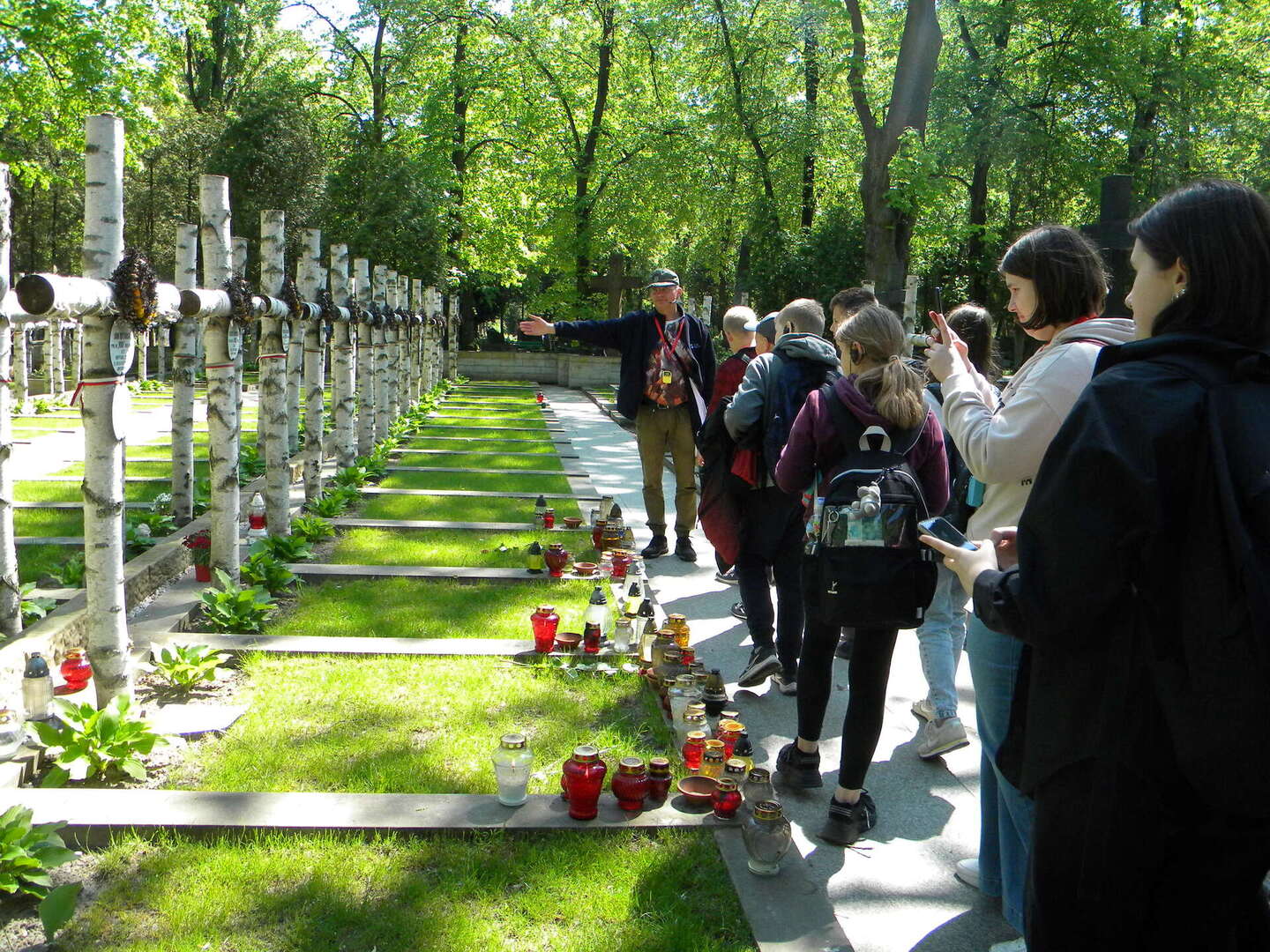 Ogromnym przeżyciem dla wszystkich było zwiedzanie Cmentarza Powązki Wojskowe. Pod czujnym okiem przewodnika odwiedziliśmy groby osób wybitnych i zasłużonych dla Polski oraz tych, którzy zginęli w walkach w obronie Ojczyzny. Byliśmy przy grobach Harcerskiego Batalionu Armii Krajowej „Zośka”, gdzie znajdują się 174 groby, w większości harcerzy – członków Szarych Szeregów i Batalionu „Zośka”, którzy zginęli podczas II wojny światowej.