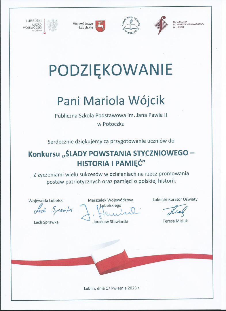 W roku szkolnym 2022/2023 obchodzimy 160. rocznicę wybuchu Powstania Styczniowego. Niewątpliwie jest to jedno z ważniejszych wydarzeń w historii Narodu Polskiego. Serdecznie dziękujemy uczniom i nauczycielom za udział w konkursie „Ślady Powstania Styczniowego - historia i pamięć” organizowanym przez Kuratorium Oświaty w Lublinie.