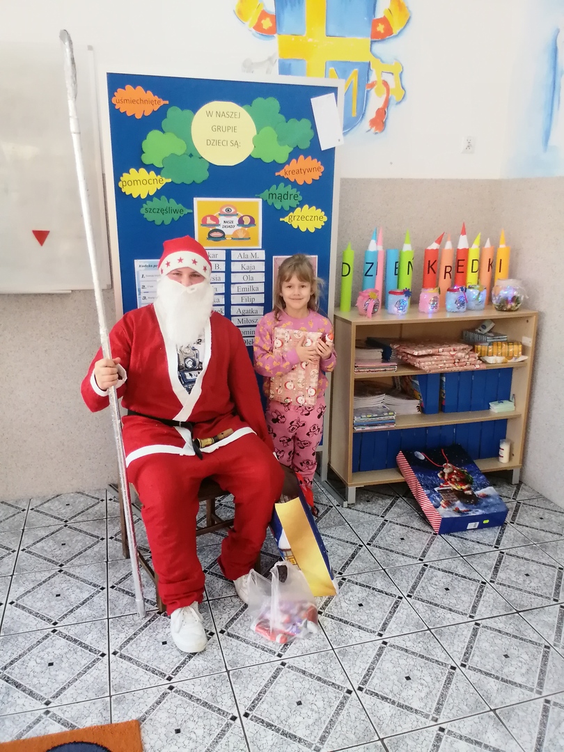 W dniu 06.12.2023r w naszym przedszkolu gościliśmy Św. Mikołaja. Wszystkie dzieci czekały z niecierpliwością na tego wyjątkowego gościa. Od samego rana wyglądały za okna i nadsłuchiwały dźwięku dzwoneczka , który nosi ze sobą Św. Mikołaj. Gdy tylko gość wszedł do klasy, na buziach przedszkolaków pojawiły się uśmiechy i radość. Przedszkolaki obiecały Mikołajowi, że się poprawią. Na koniec po zapewnieniach, że będą się starały zachowywać grzecznie w domu i w przedszkolu, Mikołaj obdarował je prezentami. Po wykonaniu wspólnego zdjęcia dzieci podziękowały i pożegnały Mikołaja. Święty Mikołaju bardzo dziękujemy za odwiedziny i do zobaczenia za rok!