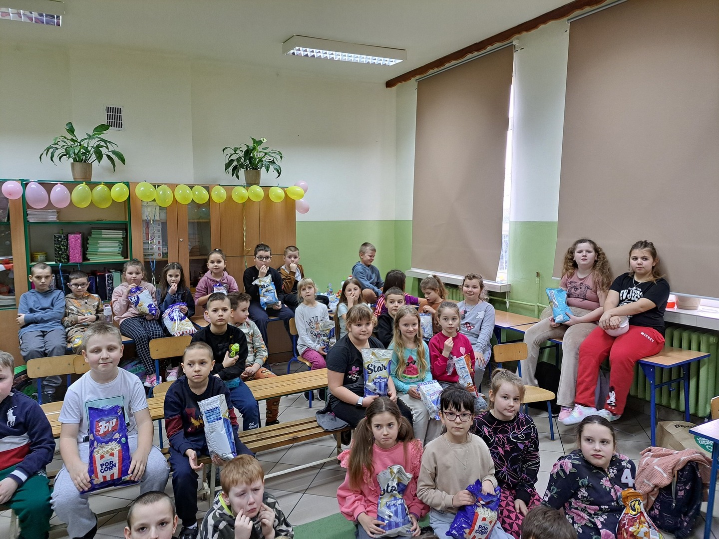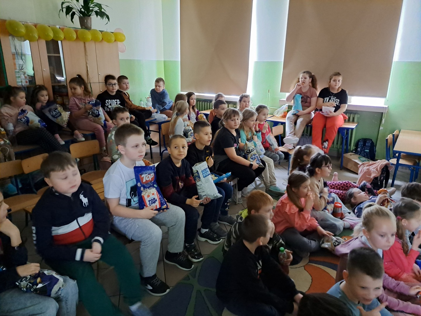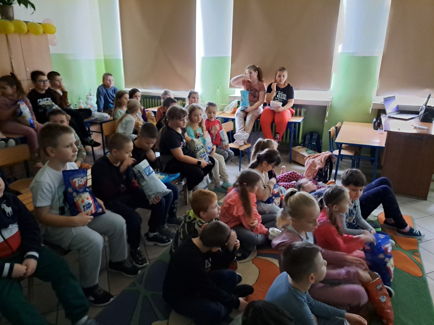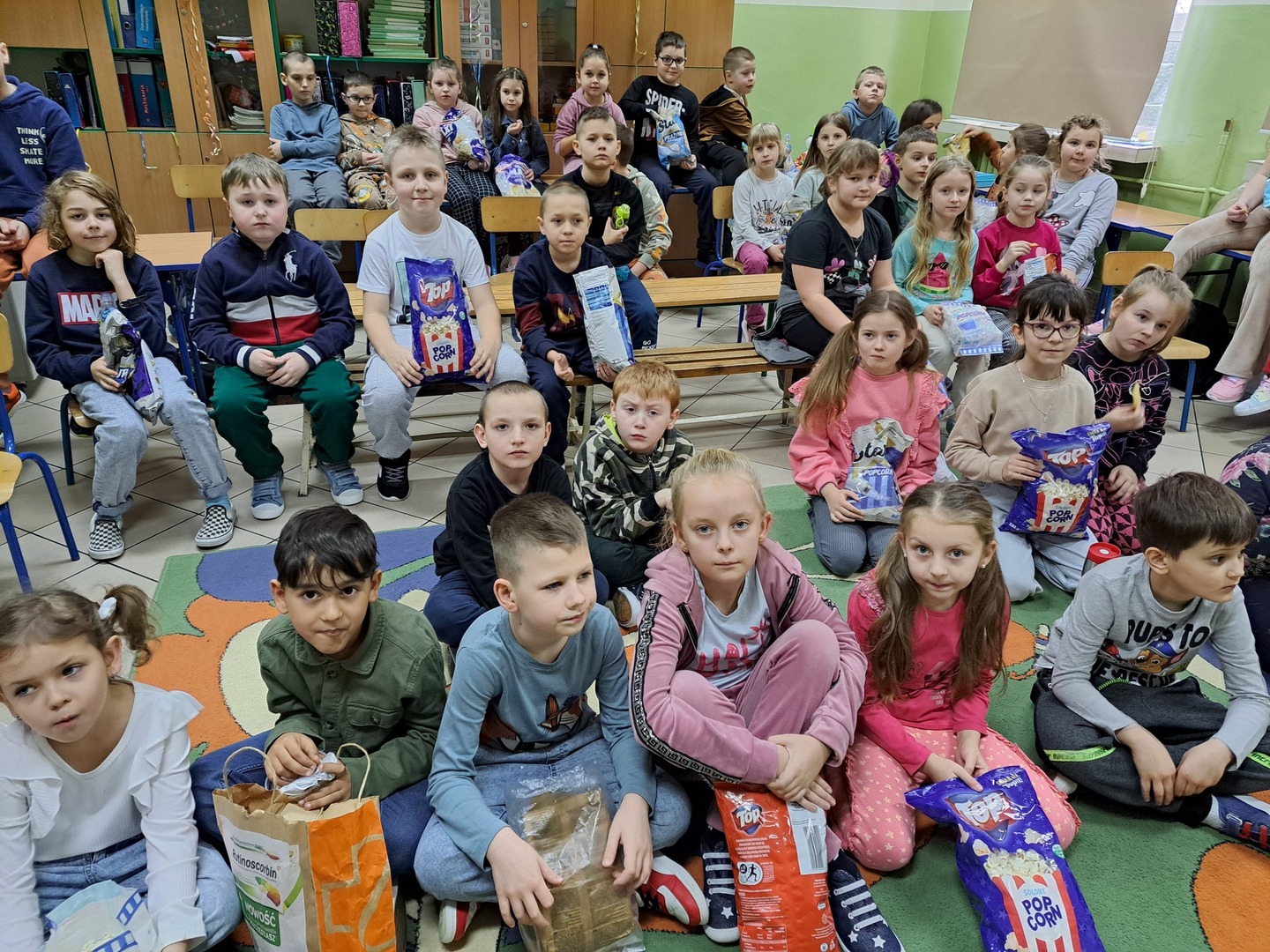 26 stycznia 2024 r. zakończył się I semestr, jesteśmy na półmetku roku szkolnego 2023/2024. Nadszedł czas na małe podsumowania. Uczniowie z kl. IV-VIII przygotowali prezentacje multimedialne, które zostały zaprezentowane wszystkim zgromadzonym. Prezentacje dotyczyły m.in. sukcesów uczniów, osiągniętych przez nich w I półroczu. W tym dniu obchodziliśmy także DZIEŃ FILMU I POPCORNU. Uczniowie oglądali filmy w grupach tj. przedszkole, kl. I – III, kl. IV –V i kl. VI – VIII. Na 3 i 4 lekcji nasza szkoła zamieniła się w sale kinowe. Większość z nas nie wyobraża sobie seansu filmowego bez chrupiącego popcornu. Dlatego też, czy to przedszkolak, młodszy, czy starszy uczeń, wszyscy tego dnia w szkole mieli przy sobie popcorn. Ta popularna, najczęściej słona, przekąska jest źródłem wielu cennych składników m.in. błonnika, wspierającego trawienie i odpowiednią pracę jelit. Po zajęciu miejsc przed telewizorami, przyszedł czas na oglądanie ulubionych filmów.