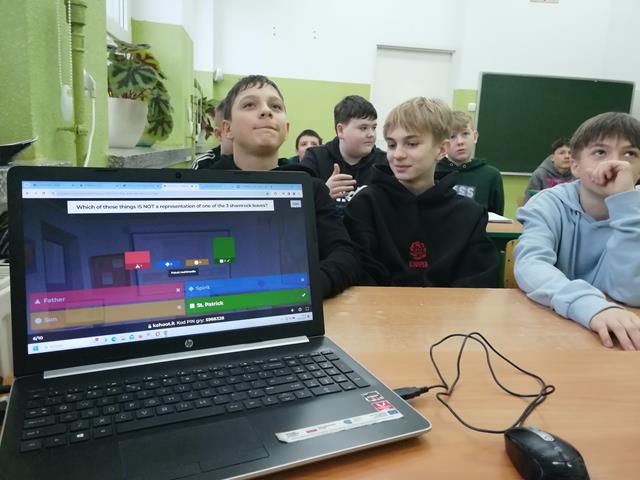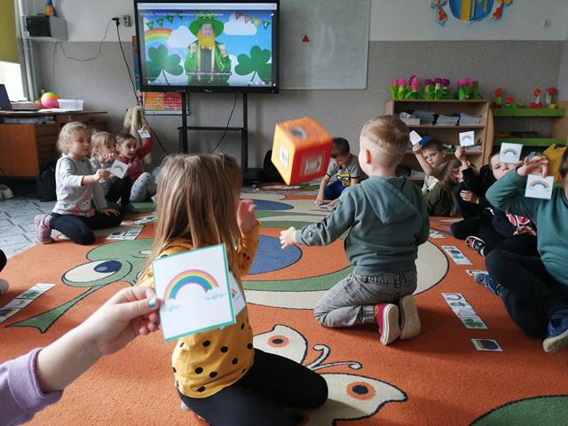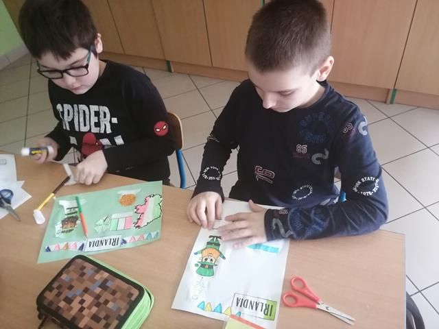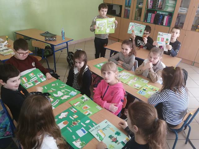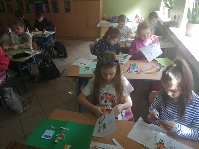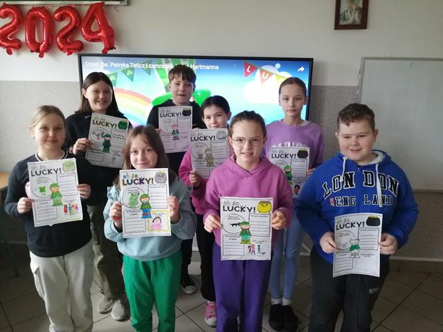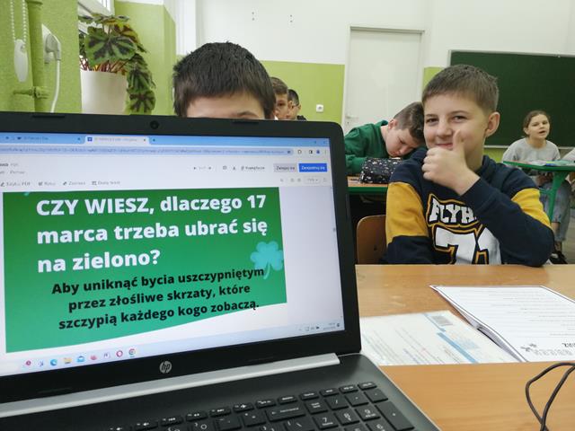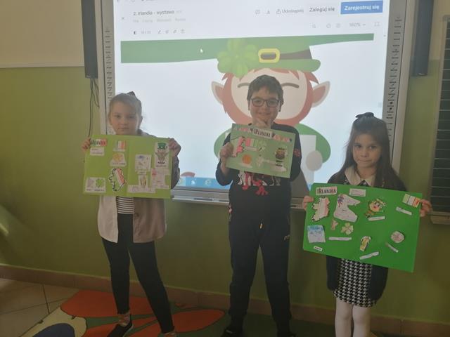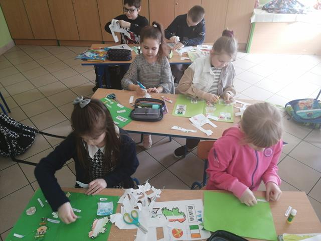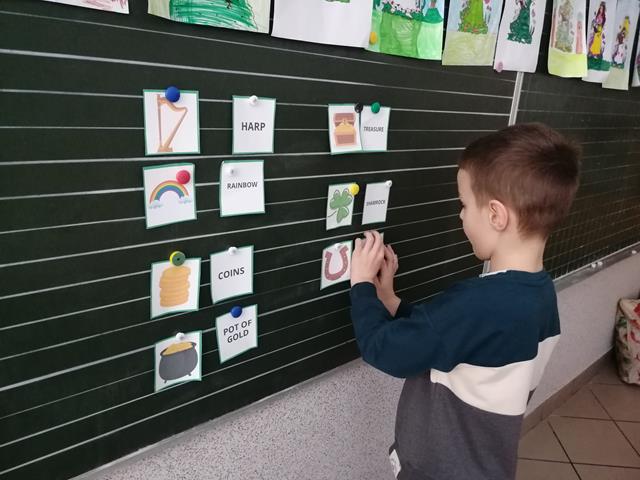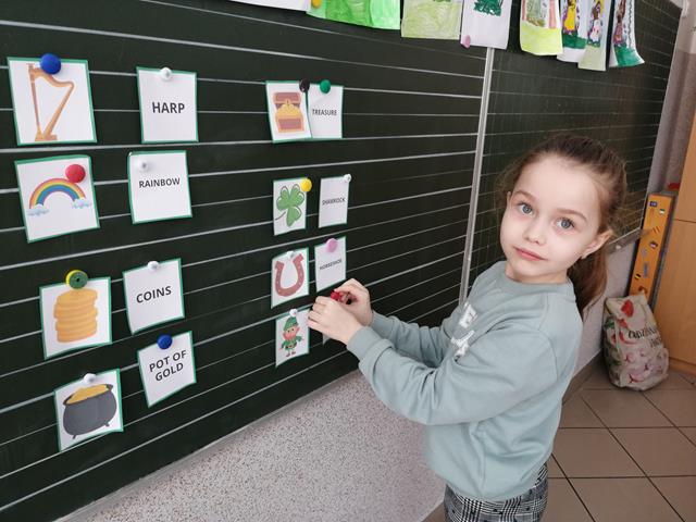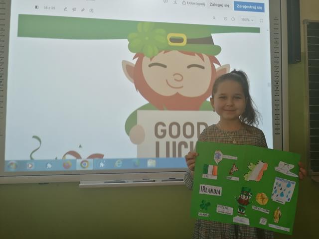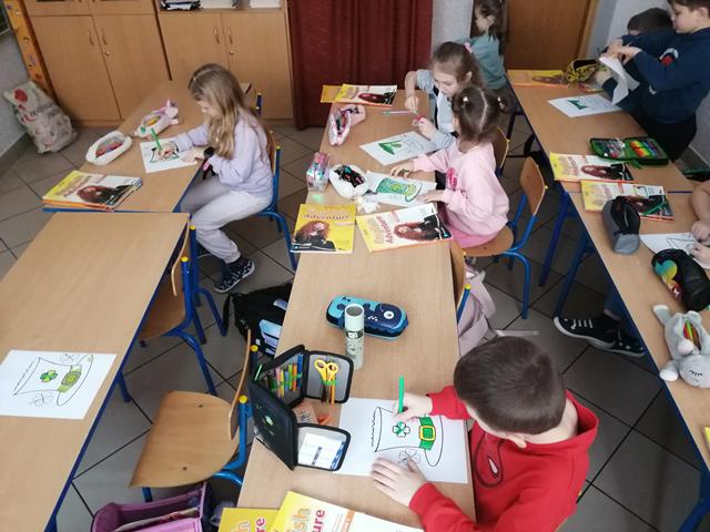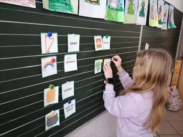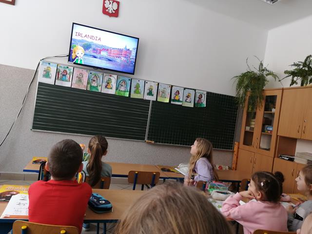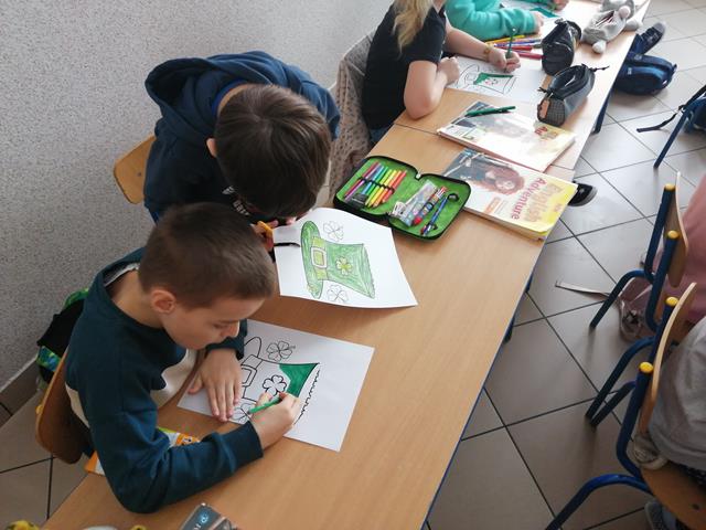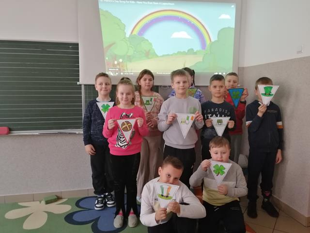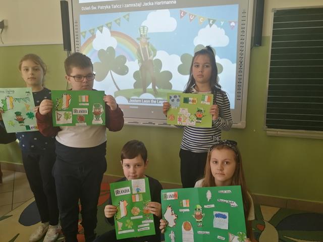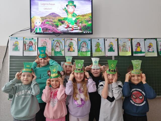 18 marca w poniedziałek w naszej szkole świętowaliśmy Dzień Świętego Patryka –patrona Irlandii. W wydarzeniu wzięły udział zarówno przedszkolaki, uczniowie kl. I-III, jak także młodzież kl. IV-VII. Głównym celem obchodów było inspirowanie uczniów tematyką związaną z Dniem Świętego Patryka, zaznajomienie z kulturą i tradycją krajów anglojęzycznych oraz rozwijanie i doskonalenie możliwości twórczych dzieci i młodzieży. Dzień rozpoczęliśmy od obejrzenia interaktywnej wystawy o Irlandii, wysłuchania historii kraju, muzyce, literaturze, sporcie i słynnych tańcach irlandzkich. Jagoda i Ola z klasy VII wykonały piosenkę w języku angielskim. Młodzież miała okazję skorzystać z tablicy multimedialnej, rozwiązując quizy oraz zagadki na platformie językowej „Learning Apps” i „Kahoot”. Z kolei dzieci z kl. I-III dowiedziały się o wielu ciekawostkach związanych ze świętem w Irlandii, rysowały i wykonywały własne kapelusze, malowały proporczyki i robiły Lapbooki o Irlandii. Najmłodsi uczniowie w oddziałach przedszkolnych obejrzeli film animowany o Irlandii, uczyły się słówek oraz wykonały prace plastyczne skrzata Leprikona.