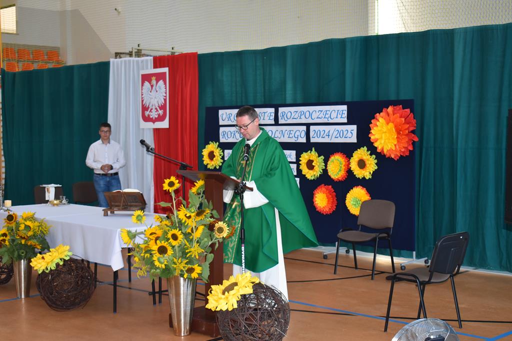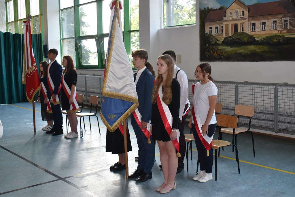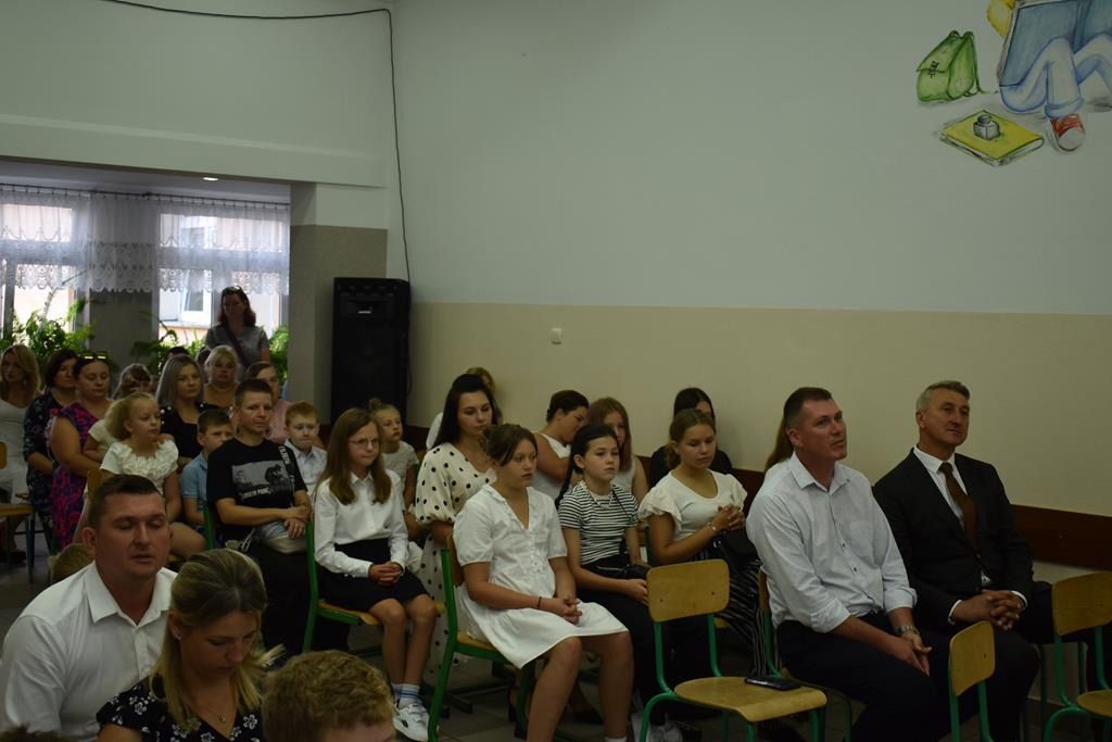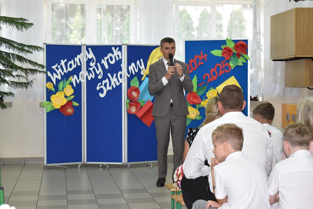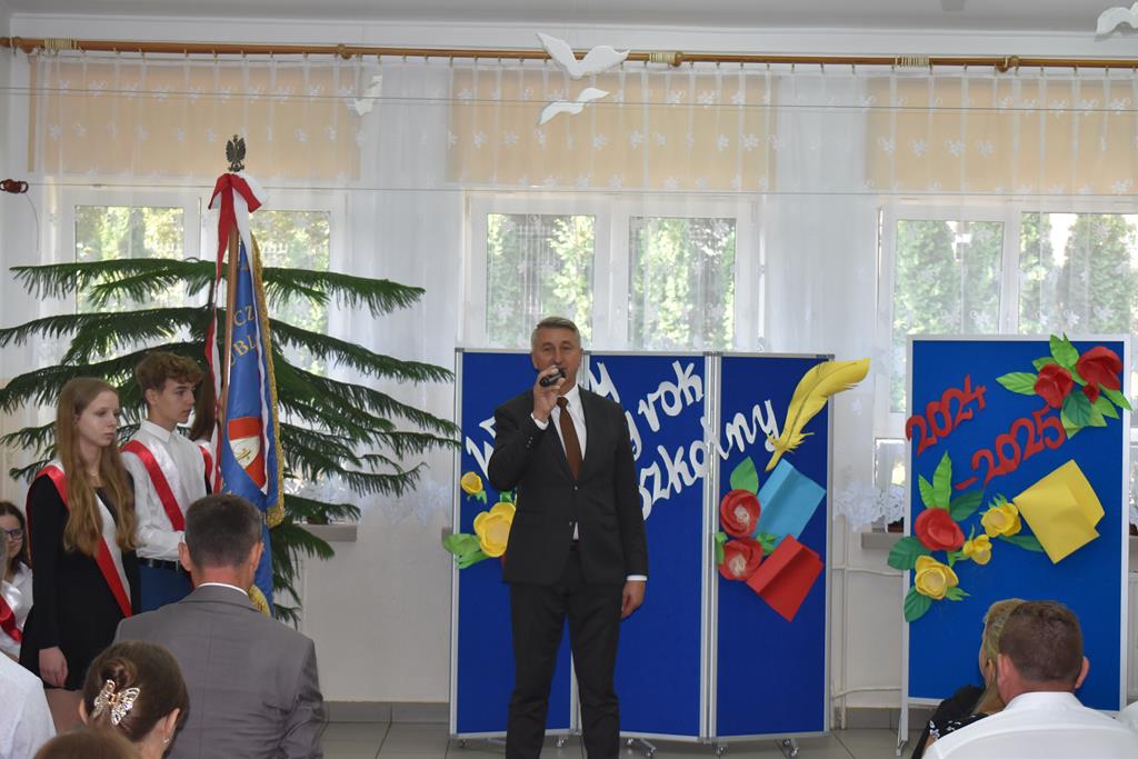 Po Mszy Świętej, uczestnicy udali się do szkoły, gdzie o godzinie 9:00 rozpoczęła się oficjalna część uroczystości. Po odśpiewaniu hymnu narodowego głos zabrał dyrektor szkoły Pan Jan Brzozowski, który serdecznie przywitał wszystkich zebranych. Nauczycielom życzył satysfakcji, zangażowania i wielu osiągnięć dydaktycznych i wychowaczych, a uczniom wielu sukcesów w nauce oraz radości z powrotu do szkolnych ław. Szczególnie ciepłe słowa skierował do pierwszoklasistów, którzy dopiero rozpoczynają swoją edukacyjną przygodę.