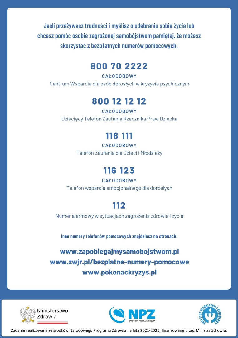 Dzieci i młodzież w kryzysie psychicznym, które mają problemy w domu, w szkole, w tym w relacjach rówieśniczych, przy zapewnieniu anonimowości i pełnej dyskrecji, mogą skontaktować się ze specjalistami i otrzymać fachowe wsparcie w najtrudniejszych sytuacjach.