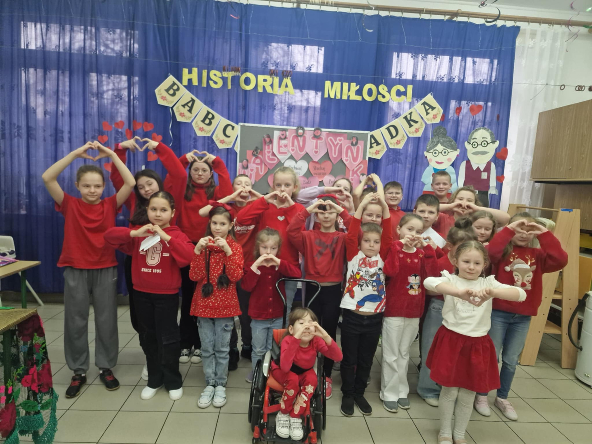 Po części artystycznej nastąpiło rozdanie walentynek, które uczniowie klas 1–5 wcześniej przygotowali dla swoich kolegów i koleżanek. Każdy mógł otrzymać kartkę pełną miłych słów, co wywołało wiele uśmiechów i radości. Następnie wszyscy uczniowie ubrani na czerwono zgromadzili się na pamiątkowe zdjęcie, tworząc niezwykle barwną i radosną grupę.