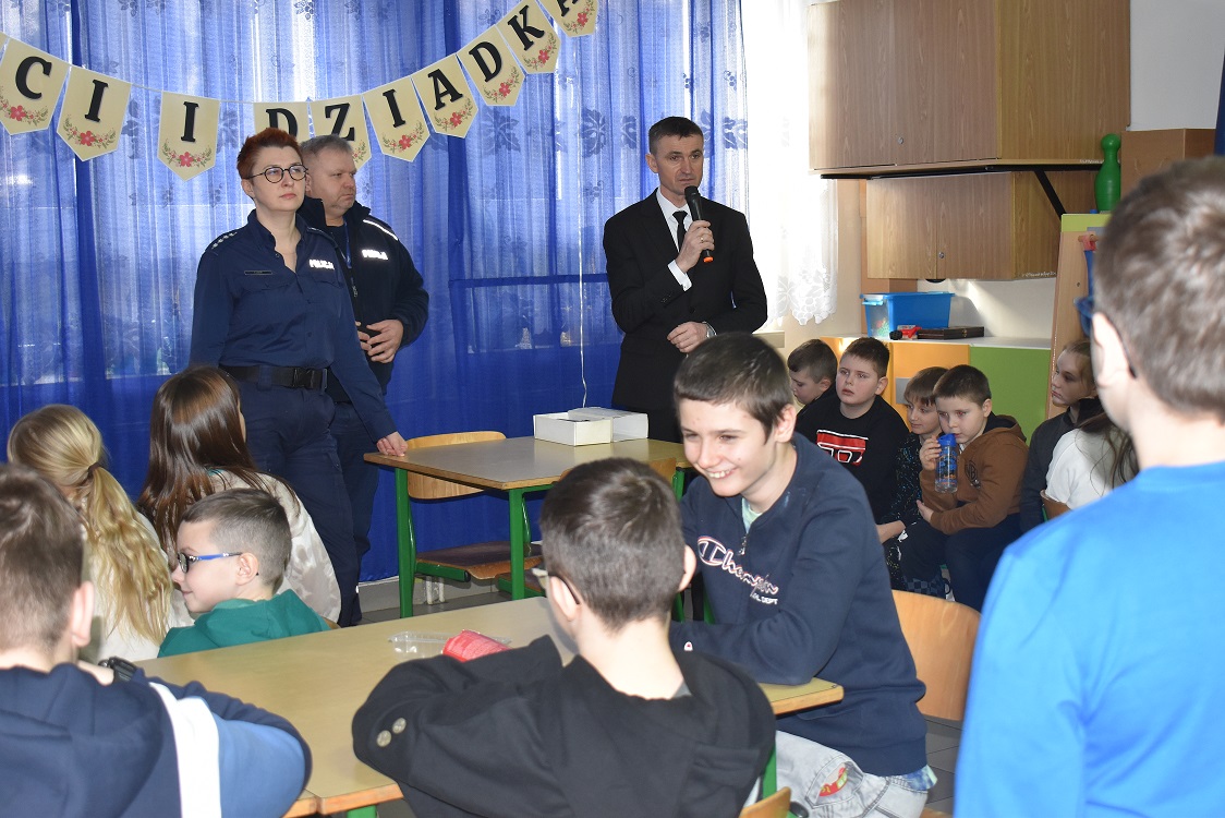 Podczas prelekcji asp. sztabowi F. Łazur i G. Igras omówili najważniejsze zasady bezpieczeństwa, zarówno podczas zimowych zabaw na świeżym powietrzu, jak i w Internecie. Uczniowie dowiedzieli się o zagrożeniach, na jakie mogą natrafić w czasie wolnym, oraz otrzymali cenne wskazówki, jak ich unikać.