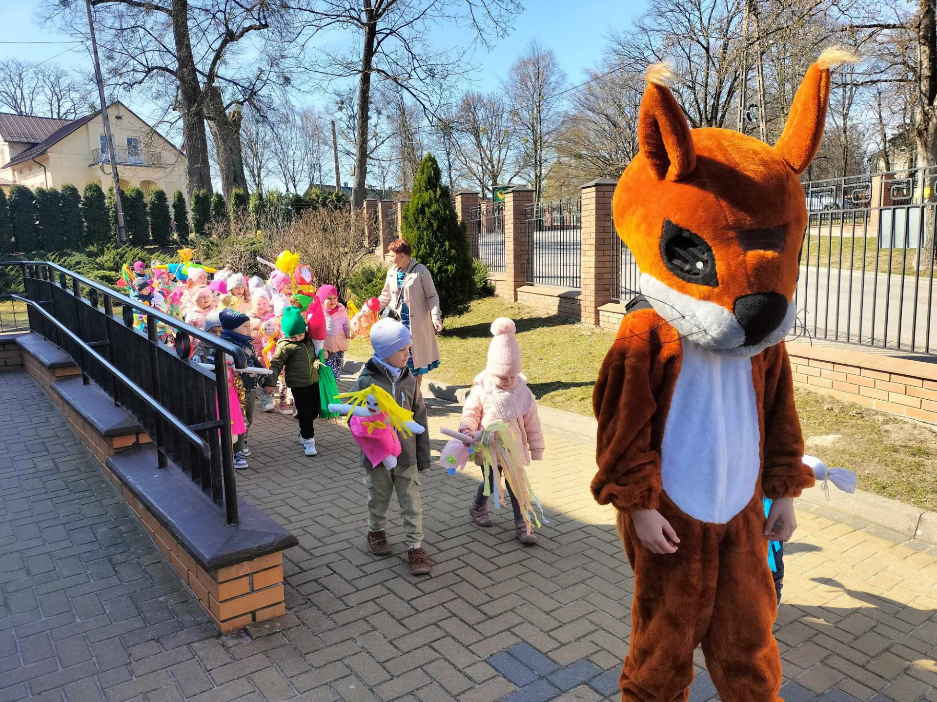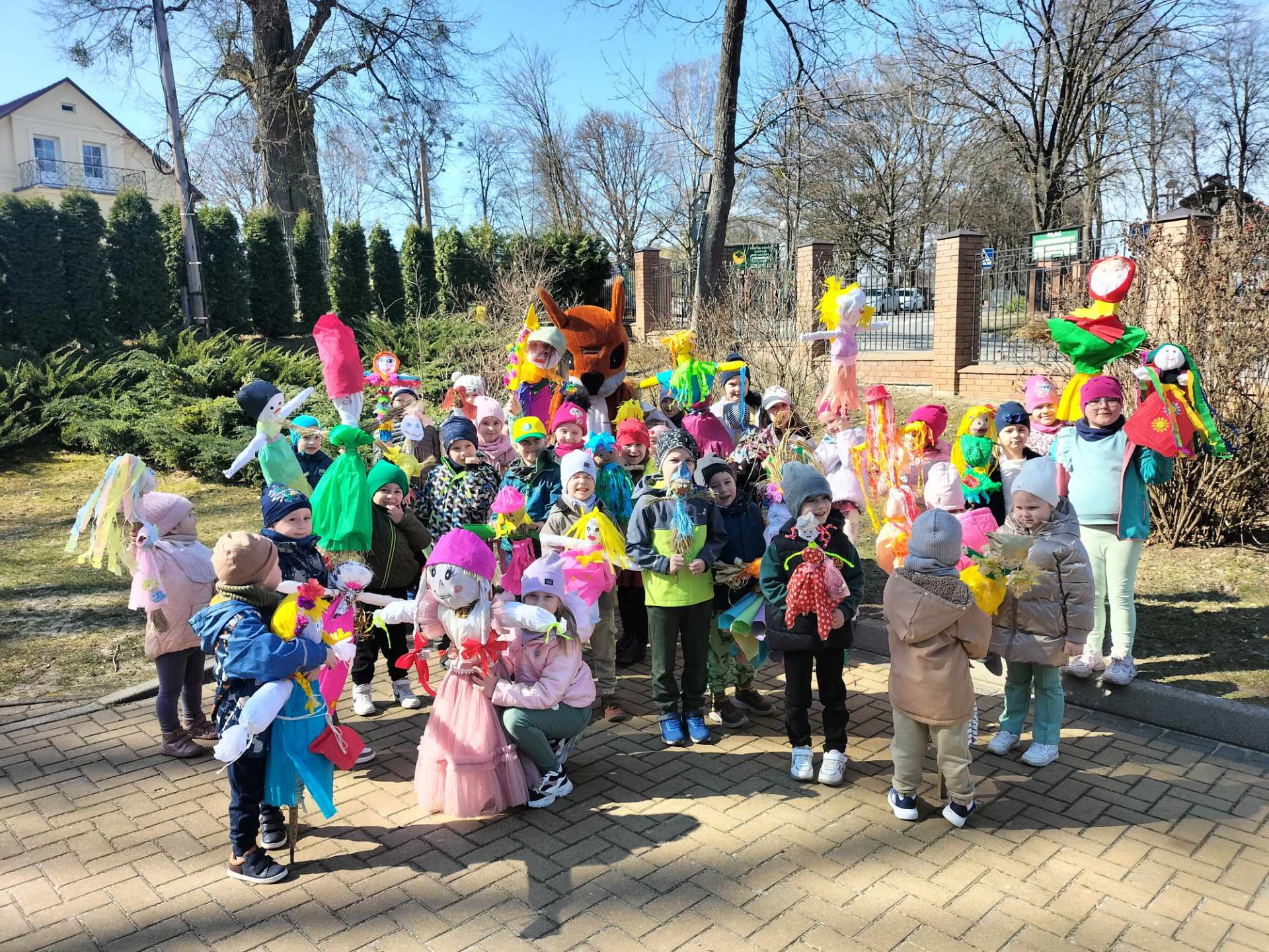 Uroczystości powitania nowej pory roku rozpoczęły się od konkursów, gier i zabaw związanych z tematyką pory roku. Były wiosenne zagadki, zabawy plastyczne oraz opowiadanie o tradycji witania wiosny. Dzieci w strojach motyli, biedronek czy żabek pięknie powitały wiosnę tańcem i piosenką. Przedszkolaki dowiedziały się o starym zwyczaju topienia Marzanny. Mimo wielu atrakcji najbardziej oczekiwaną częścią dnia było wyjście na spacer, podczas którego mogły pożegnać zimę i powitać wiosnę. Maluchy i starszaki wyruszyły barwnym korowodem, trzymając w rękach słomiane Marzanny. Na czele korowodu kroczyła wiewiórka. Podczas przemarszu dzieci obserwowały piękno budzącej się do życia przyrody, wypatrywały pączków na drzewach, pierwszych kwiatów. Śpiewały piosenki o tematyce wiosennej. W ten sposób wszystkie dzieci chciały wyrazić swoją radość z przyjścia nowej pory roku. Dzieci powróciły do przedszkola z nadzieją, że upragniona wiosna na dobre pozostanie z nami. Ten dzień z pewnością był dla każdego przedszkolaka radosnym i niezapomnianym wydarzeniem. Jesteśmy pewni , że starania naszych wspaniałych przedszkolaków sprawią, że Wiosna zawita do nas na dobre.