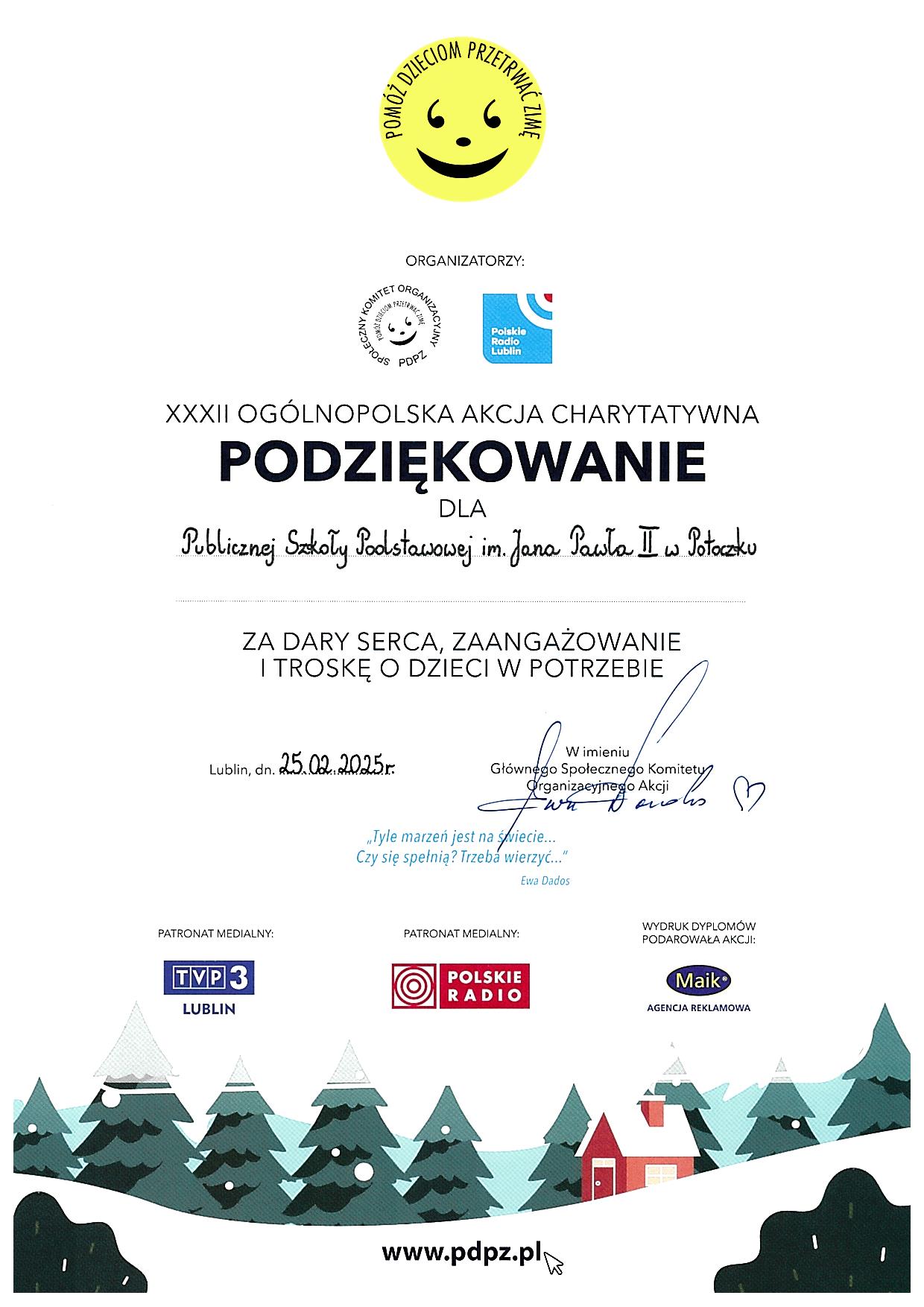 Uczniowie i pracownicy Publicznej Szkoły Podstawowej im. Jana Pawła II w Potoczku po raz kolejny wzięli udział w XXXII Ogólnopolskiej Akcji Charytatywnej „Pomóż Dzieciom Przetrwać Zimę”. Dzięki ogromnemu zaangażowaniu społeczności szkolnej udało się zgromadzić dary, które trafiły do potrzebujących dzieci, zapewniając im ciepło i wsparcie w trudnym zimowym okresie.