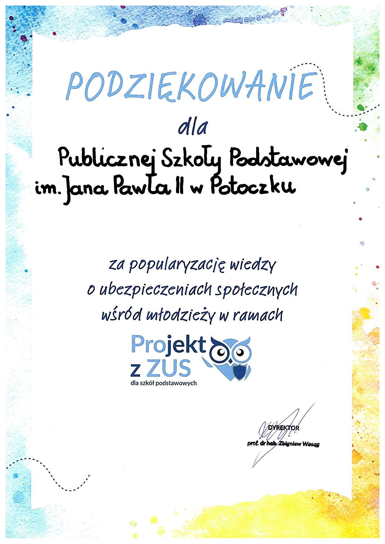 Z przyjemnością informujemy, że Justyna Siek z klasy 8 wzięła udział w szkolnym konkursie edukacyjnym „Projekt z ZUS”, organizowanym przez Zakład Ubezpieczeń Społecznych. Celem było przybliżenie tematyki ubezpieczeń społecznych oraz zasady solidarności międzypokoleniowej.