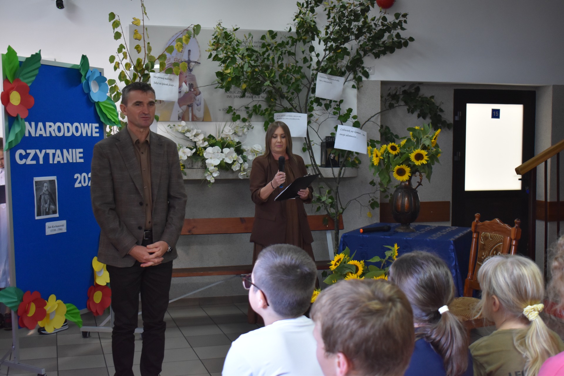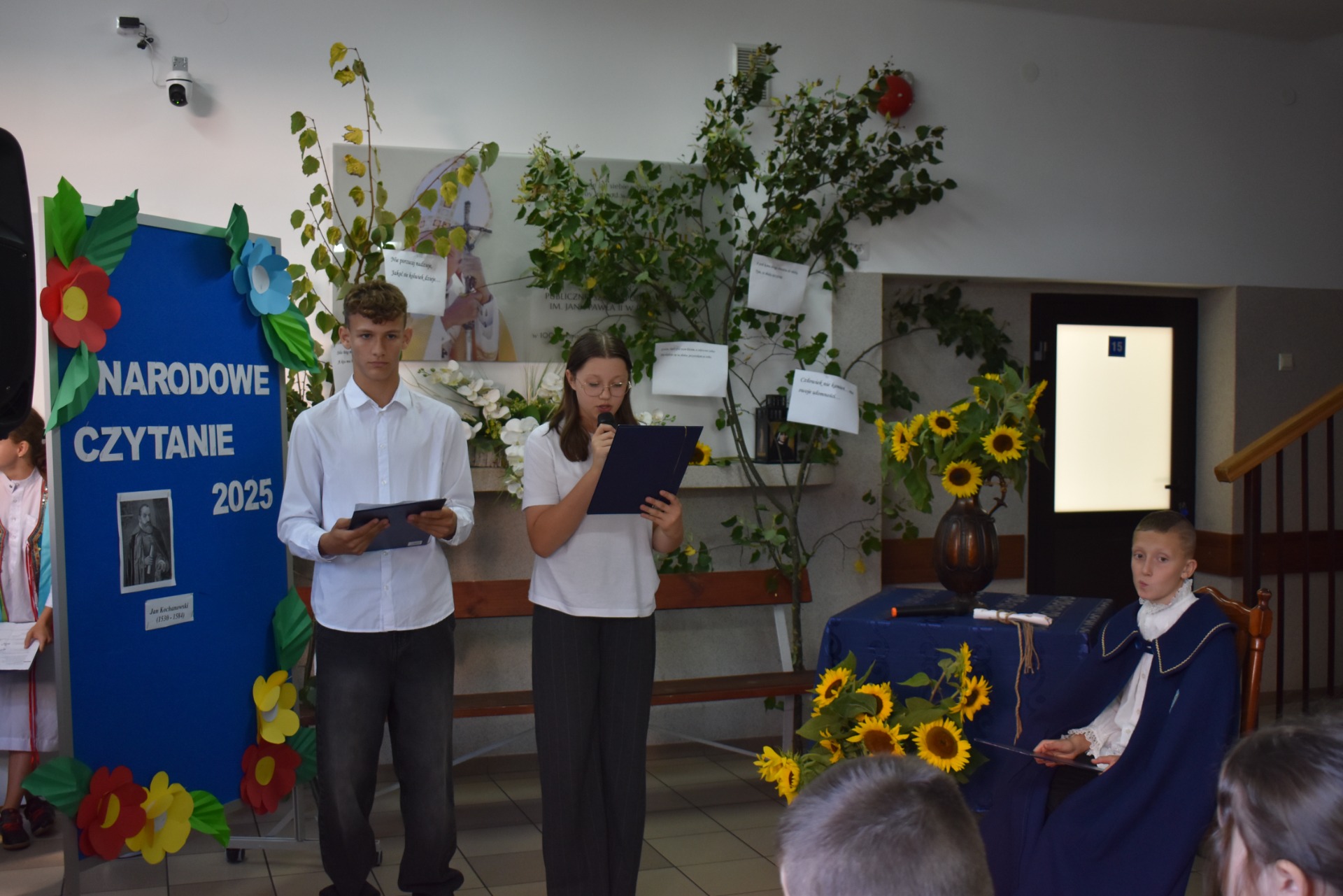 Podczas tegorocznego Narodowego Czytania, które w Publicznej Szkole Podstawowej im. Jana Pawła II odbyło się 08 września 2025 roku, mieliśmy okazję obcować z dziełami Jana Kochanowskiego – poety, który w mistrzowski sposób potrafił uchwycić zarówno piękno świata, jak i słabości ludzkiej natury. W jego słowach odnajdujemy ponadczasową prawdę o człowieku: że jest on jak kamień – trwały, silny i zakorzeniony w ziemi, a jednocześnie pełen ułomności, podatny na zranienia i nieustannie wystawiony na próbę losu.