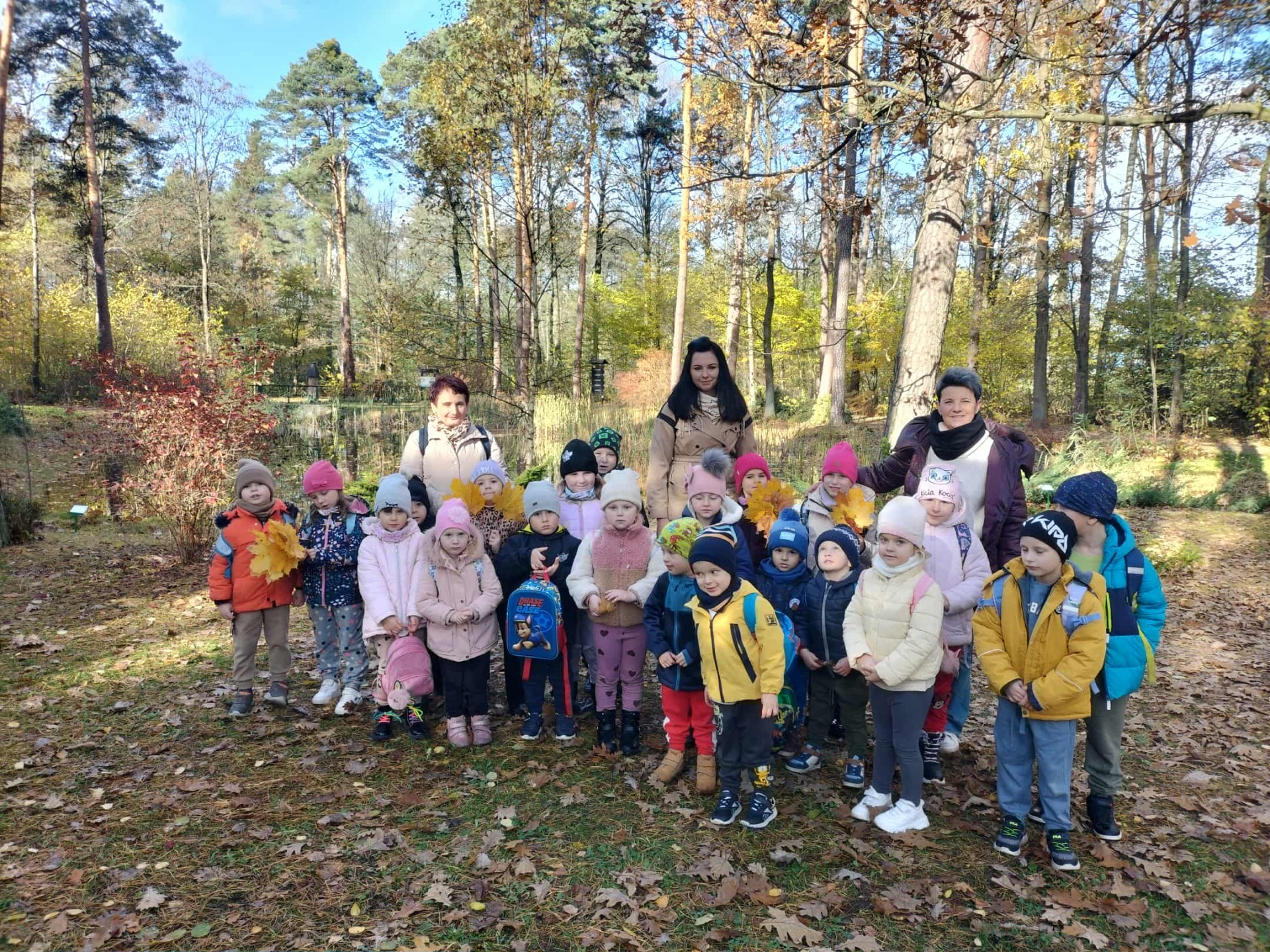 Następnie przedszkolaki udały się na spacer, obserwując różne gatunki roślin. Największą atrakcją było zbieranie nasion dębu i tworzenie jesiennego portretu, który zainicjowała pani Małgorzata.