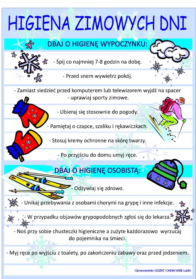 - Wychodząc bawić się na powietrze, ubieraj się stosownie do pogody, tak, aby nadmiernie nie wychłodzić swego organizmu. Idąc na górkę, czy dłuższy spacer w zimowej aurze warto się zaopatrzyć w ciepły napój w termosie;